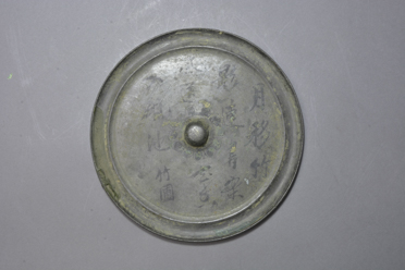 方形,伏兽钮,钮外由一凸起方框分为内外两区,内区四瑞兽追尾环列,四角饰孔雀屏纹,其系空间点缀十四串枝蔓缠连的葡萄纹;外区饰三十三串枝蔓缠连的葡萄和十二禽鸟,禽鸟六飞六栖,造型生动,四角饰孔雀屏纹。