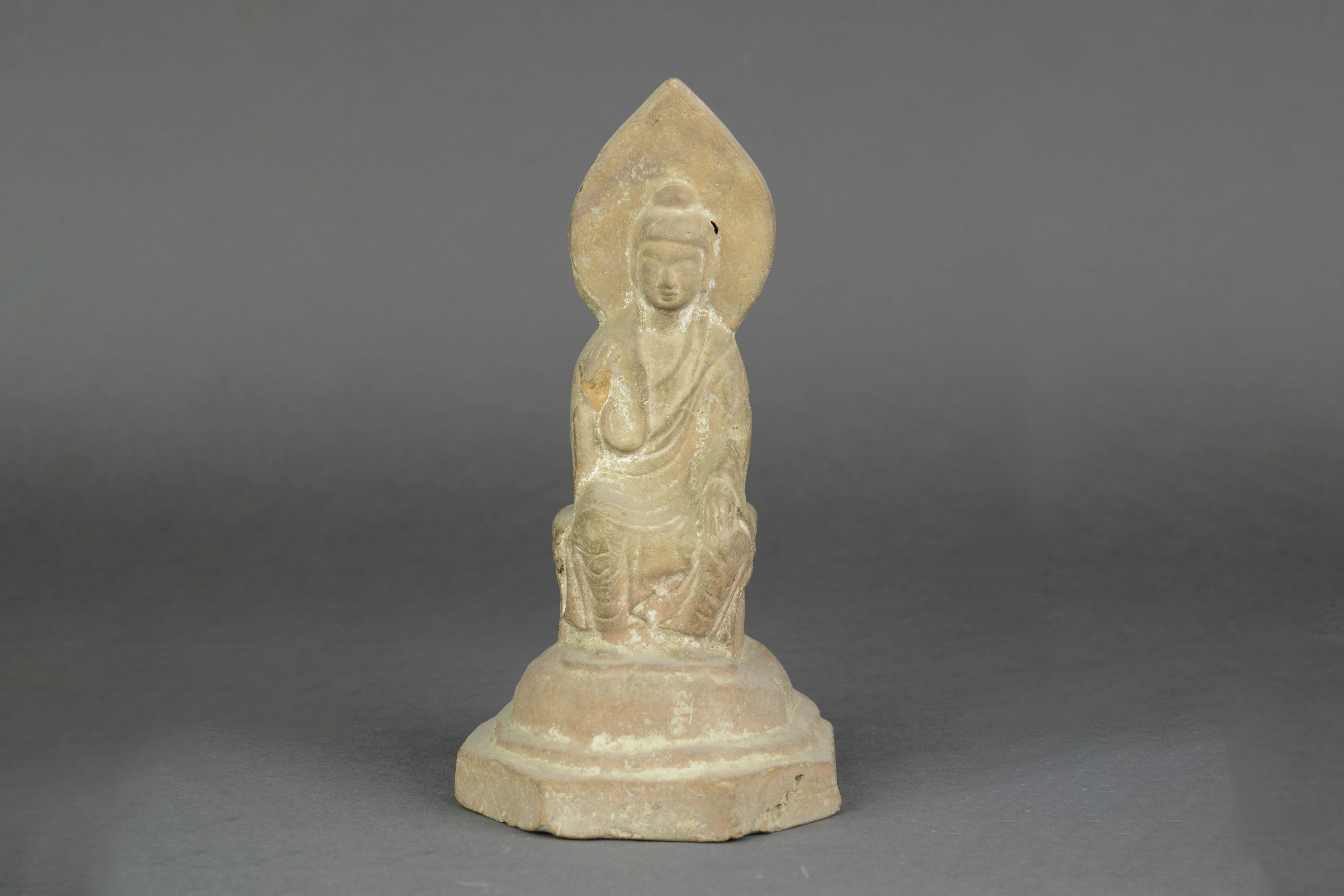 细泥红陶。佛呈坐姿,馒头状肉髻,发髻平展,面相长方形,眉弯曲,目微闭,隆鼻,厚唇,脑后有桃形头光,长颈,溜肩,内着交领衫,外着裹衣博带式袈裟,左臂下垂,手扶膝上,右臂上举,手扶肩上,跣足,坐床方形,下有上圆下方八角形须弥座。
