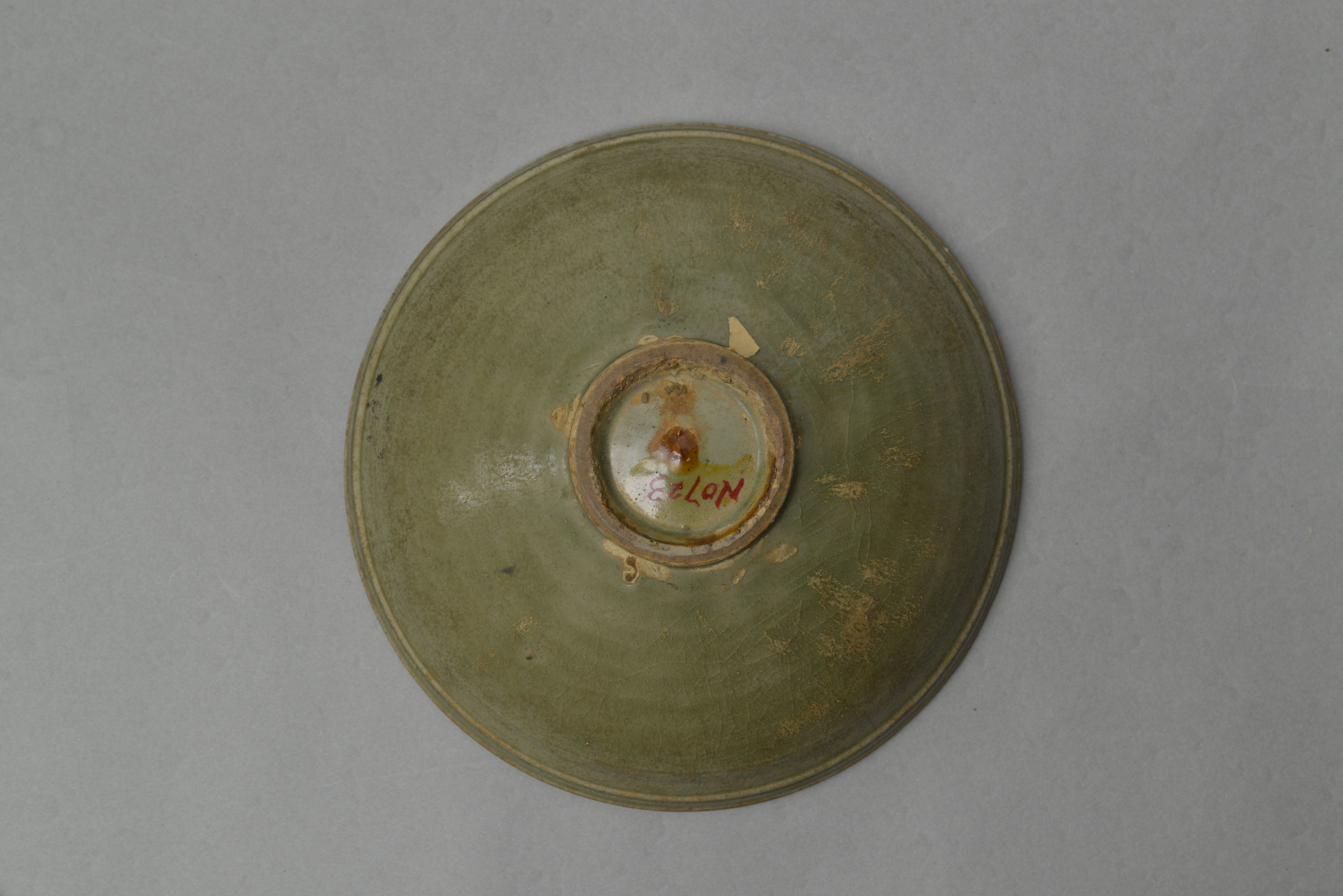 敞口,圆唇,口沿下作一周凸棱,弧腹,小圈足。内壁刻莲花纹,施青釉,有开片,足圈露胎。