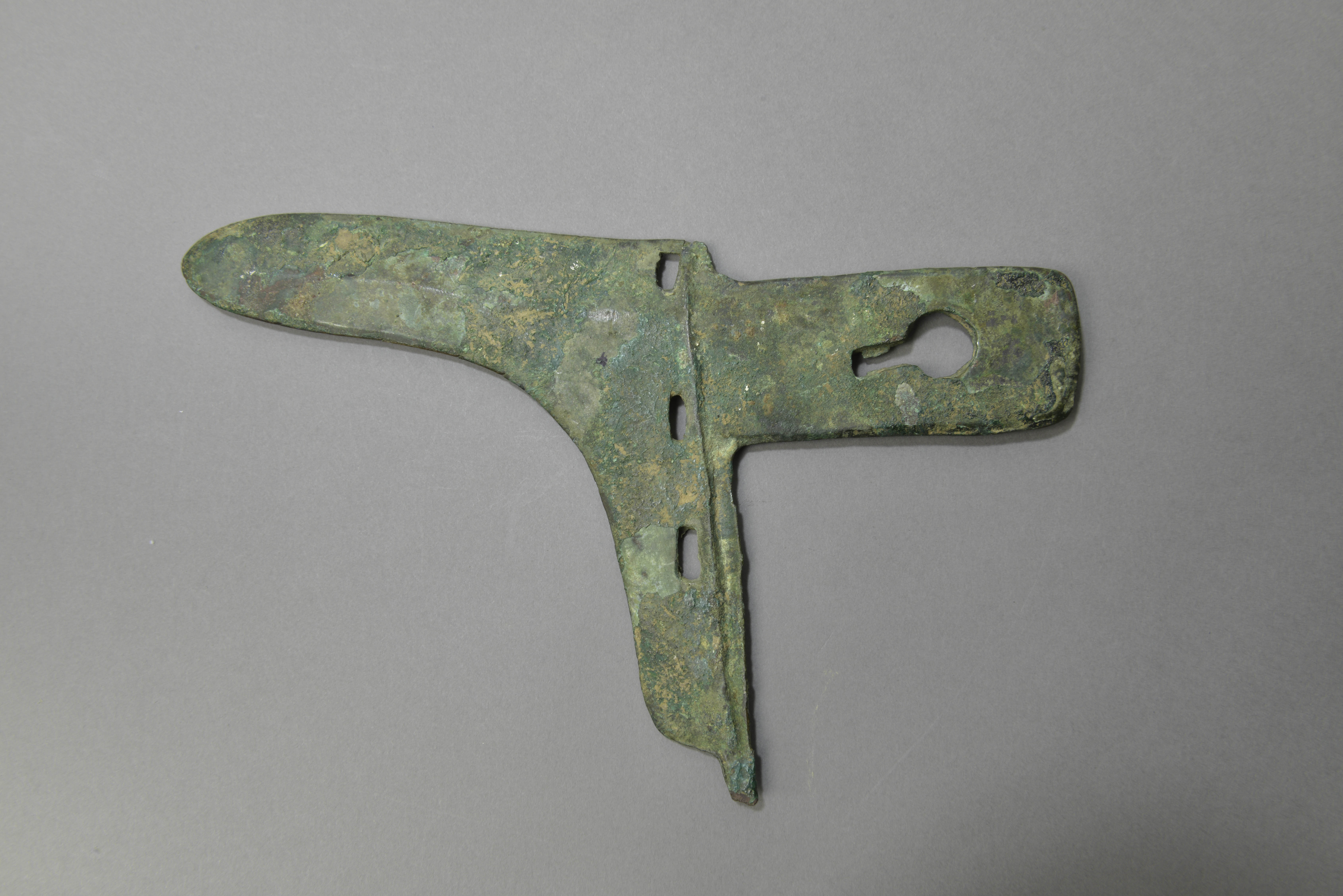 微上扬,中部起脊,弧形尖,长胡,近阑部三穿,长方形,内上勺形穿。