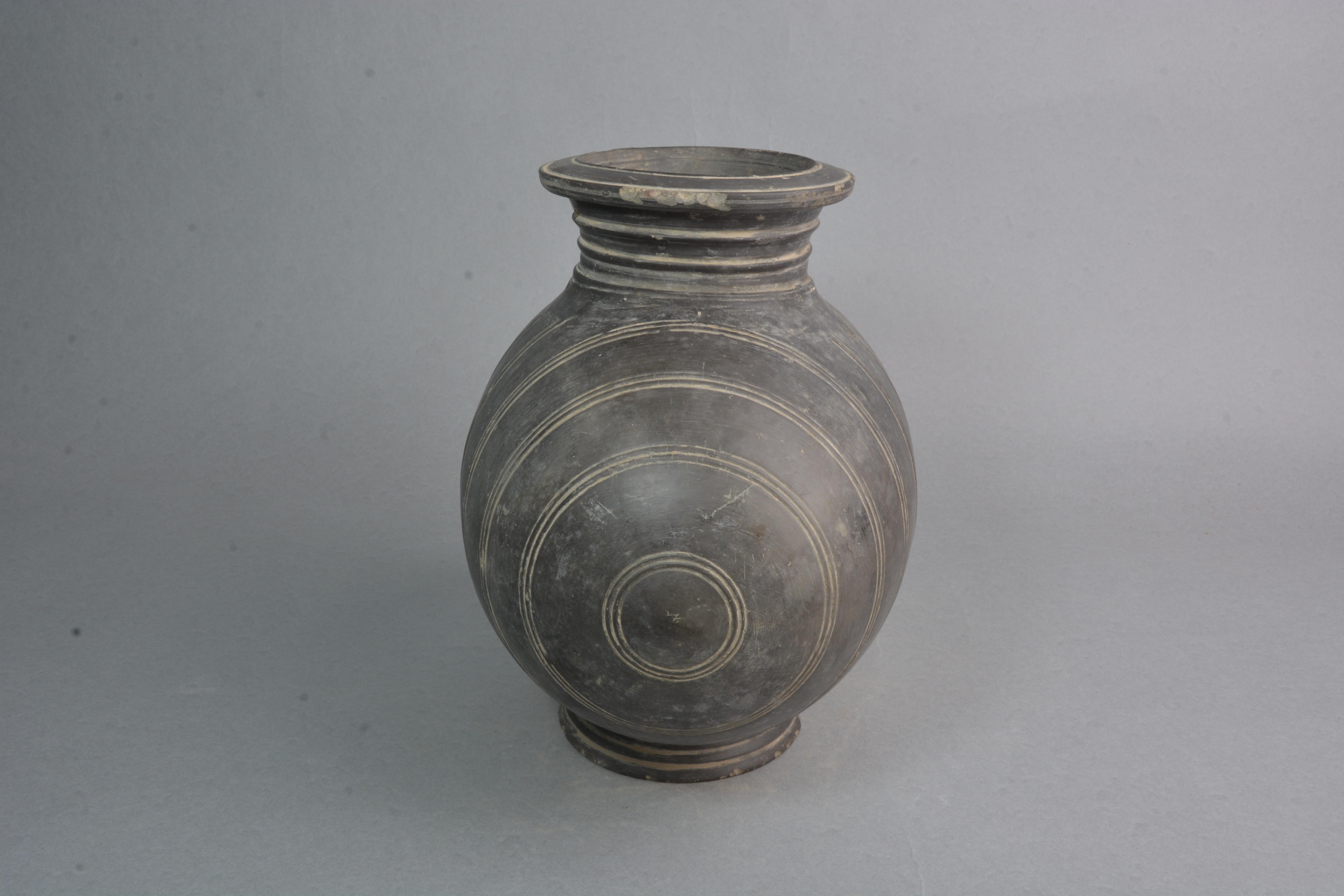 灰黑色细泥陶,胎质坚硬。唇口,短束颈,横向长椭圆形腹,似蚕茧,喇叭形圈足。唇部饰凹弦纹,颈部、足部均饰横向凸弦纹,腹部饰纵向凹弦纹带。